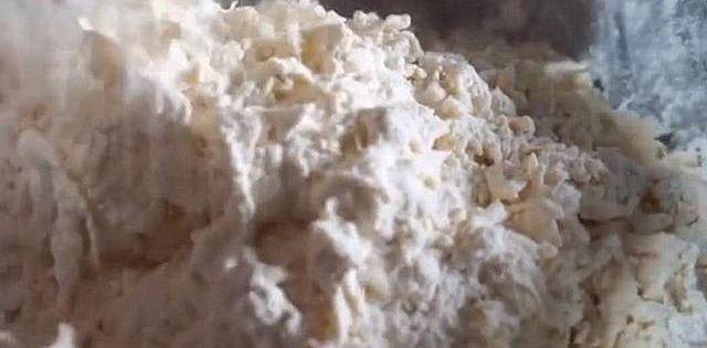 步驟三,現在我們來準備面疙瘩。往盆中倒入適量的面粉,首先往盆裡加入食鹽,用筷子把食鹽稍微翻拌一下。再加入水,水一定要慢慢加,邊加邊攪拌,可以看到,面粉變成絮狀就可以瞭。