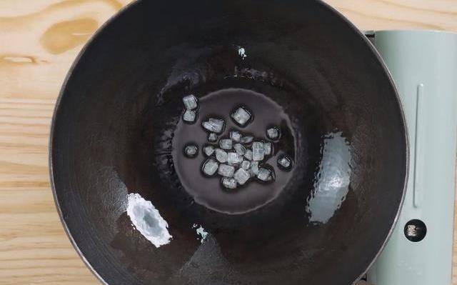 第四步:鍋底留油,把準備好的冰糖倒入鍋中,用中小火炒化,並且熬制成棕紅色的糖漿。
