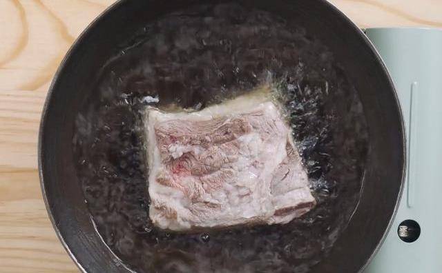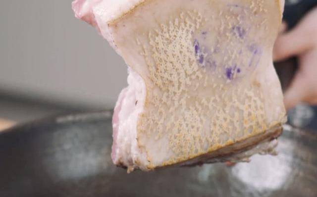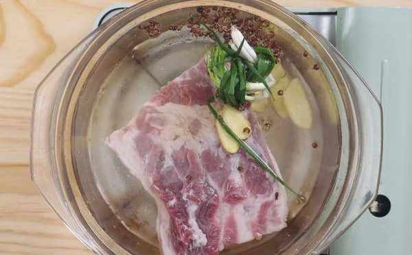 第一步:首先我們把買回來的帶皮五花肉放入鐵鍋中,把帶皮的一面放在鐵鍋底面烤焦,然後用刀刮去表面的焦色,清洗幹凈後放入350ml的清水鍋中,加入準備好的蔥結,薑片,花椒,一勺料酒,開大火煮沸之後撈出鍋邊的浮沫,然後蓋上蓋轉小火,燜煮六分鐘後取出洗凈。