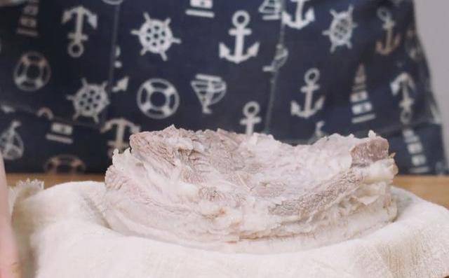 第二步:準備兩張雙層疊加的幹紗佈,把煮過一遍的五花肉用其包裹,完全吸幹表層的水分,這樣可以在之後的油炸過程中,減少濺油現象的發生。當然啦,如果沒有是紗佈的話,吸水紙也是非常不錯的選擇。