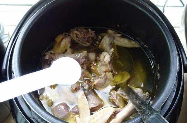 4.醃制過的蔥段和薑片也可以繼續用的,連雞塊一起放入電壓鍋裡,加入清水,電壓鍋不會流失水分,所以水量這點就夠瞭,把黃酒倒入進去。