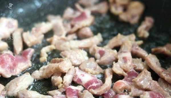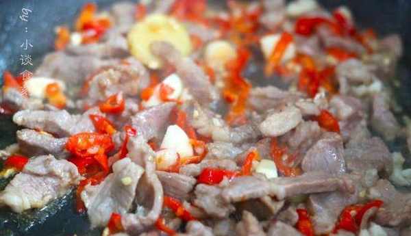 3、鍋中倒入植物油,熱鍋冷油,接著放入醃制好的豬肉片進行煸炒,炒的時候顏色變深就可以放入紅椒瞭,我把紅椒切的有點小,這樣比較入味。