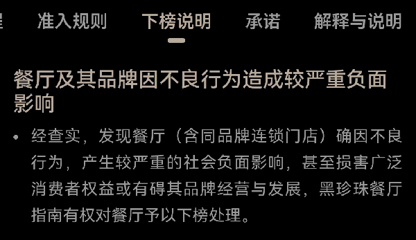 其中,餐廳準入規則“下榜說明”中明確,餐廳及其品牌因不良行為造成較嚴重負面影響,甚至損害廣泛消費者權益或有礙其品牌經營與發展,黑珍珠餐廳指南有權對餐廳予以下榜處理。