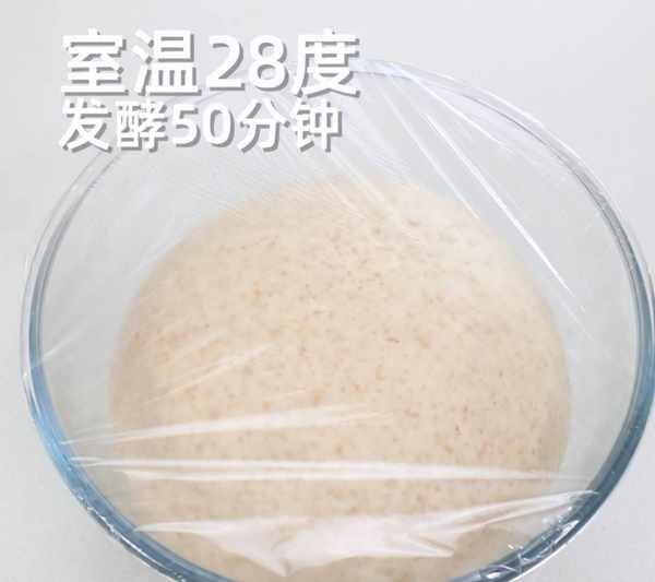 面團蓋保鮮膜,室溫28度發酵50分鐘,具體以狀態為準,即體積膨脹2倍,手指戳洞清晰,如果小洞縮攏瞭,就是發酵不足,如果一戳面團就泄氣,說明發酵過度瞭。