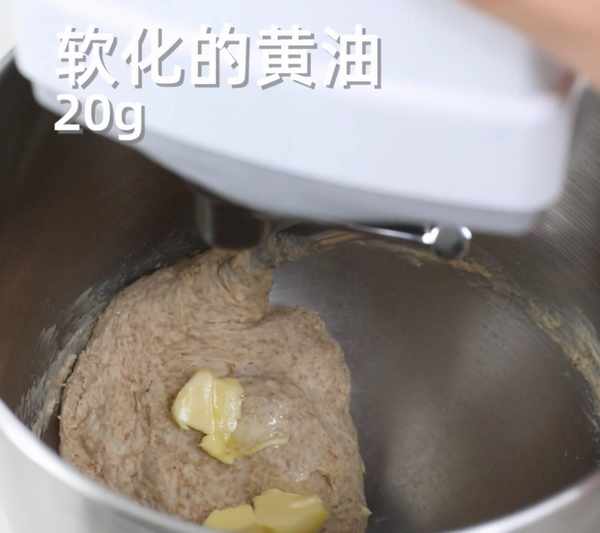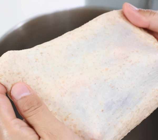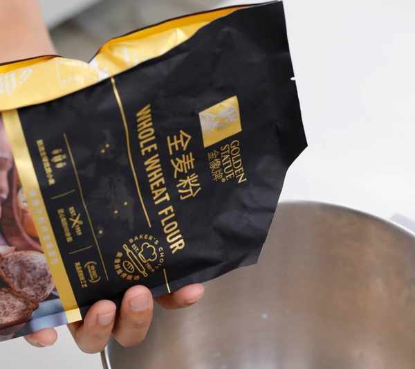 接著加入全麥粉90g。今天配方全麥粉比例達到瞭較高的30%,加上普通全麥粉比較難出膜,如果你想做出口感柔軟的全麥吐司,建議大傢用跟我一樣的全麥粉。