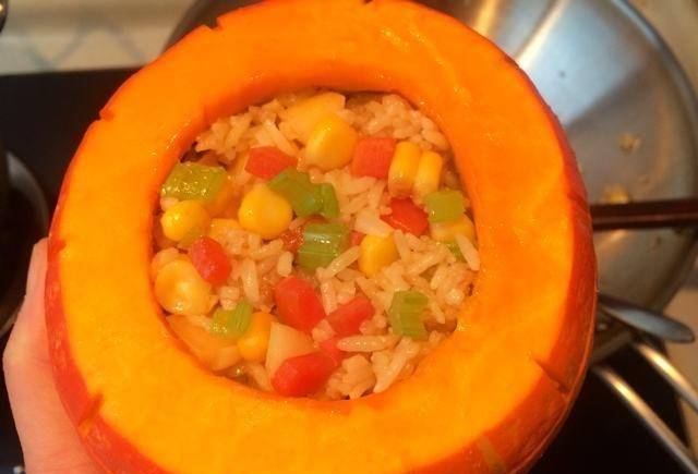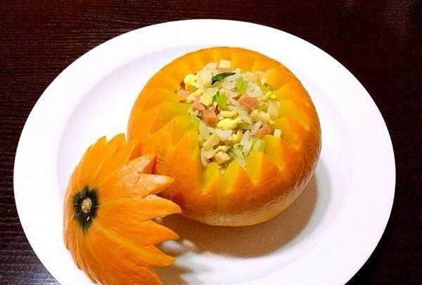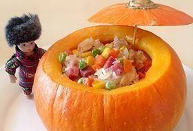 大米、南瓜50克、洋蔥半個、雨潤香肚1/4個、油1茶匙、鹽、胡椒粉半茶匙。