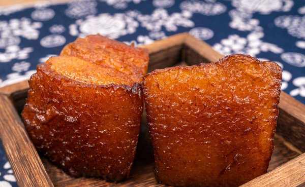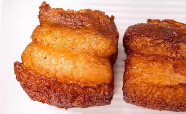 7. 最後將炸好的虎皮扣肉撈出,瀝幹油後,用刀在虎皮扣肉的背面切開即可食用。