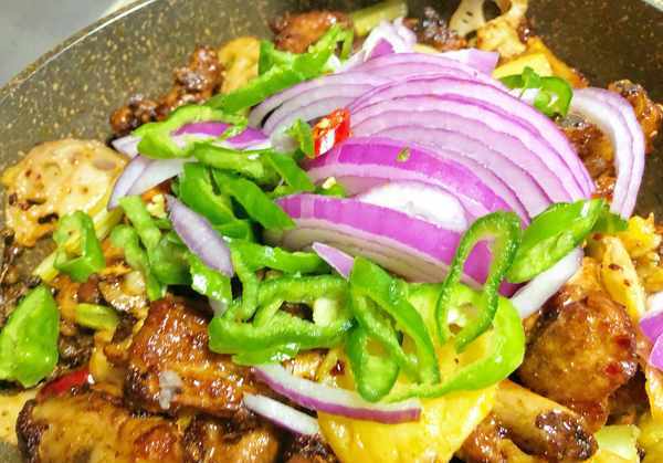 6、火鍋底料炒融化以後,先在鍋中下入排骨、土豆、蓮藕和芹菜,翻炒入味,然後再下入洋蔥、青辣椒以及小米辣翻炒均勻。
