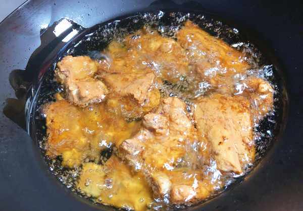 3、起鍋倒適量油,等油溫6成熱以後下入醃制好的排骨,將排骨炸至金黃酥脆以後撈出控油。