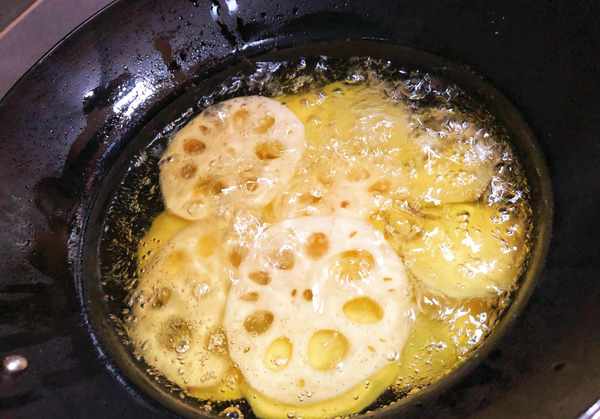 4、排骨炸好以後,繼續在油鍋中下入土豆片和蓮藕片,同樣將這兩樣配菜炸熟後撈出備用。