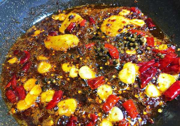 5、重新起鍋燒油,先在鍋中下入3片生薑、3瓣大蒜、1把麻椒以及適量幹辣椒煸炒出香味,接著再下入1塊火鍋底料炒至融化。