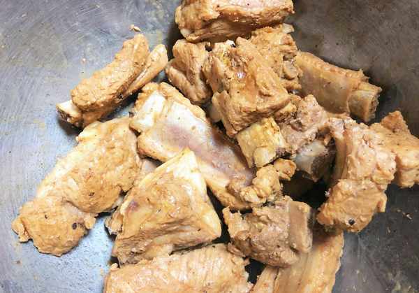 2、將洗凈的排骨放入盆中,加入1勺生抽、1勺淀粉、少許十三香以及少許胡椒粉,醃制15分鐘以上,使排骨入味。