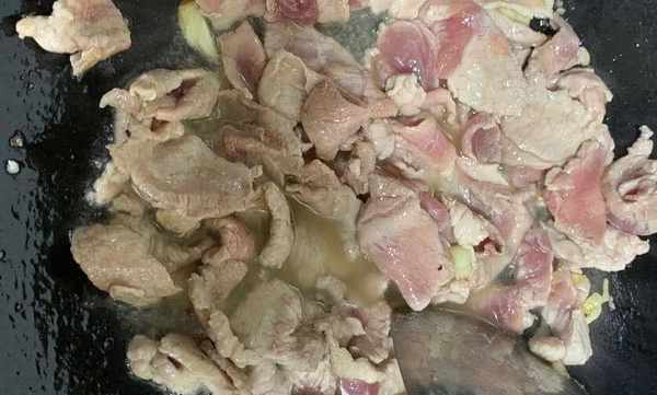 下一步是煎瘦肉。將油放入鍋中。當油熱時,加入薑和大蒜炒香。然後將切好的肉放入鍋中。炒的時候會有一些水,所以肉片可以多炒一些,會更香。做這道菜時不用擔心會炸瘦肉。相反,多烤一會兒味道會更好。