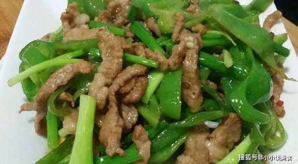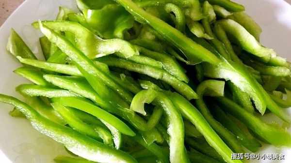 肉片切好後,就該準備配菜瞭。一般以青椒吃得最多。準備青椒切絲備用。鍋裡倒油,下薑蒜爆香,然後把切好的豬肉片放入鍋中,炸熟變色後撈出,再把切好的青椒倒入鍋中炒至熟。