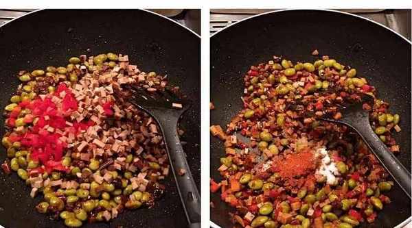 用小火煮沸,最後在上面撒上切碎的青紅辣椒,然後在鍋裡煎。