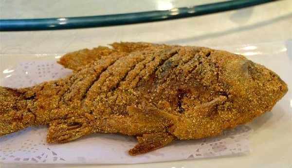 爆煎鯽魚:據說是這傢店的獨創菜品,也是推薦菜之一,不知道別的店是不是真的沒有。一個點一條,這鯽魚個頭也還挺大的。看著表面沒什麼特別的,打開才知道,原來裡面更豐富。用秘制的配料放在鯽魚的肚子裡醃制使魚入味,再進鍋用油煎熟。整個魚身完整,魚肉也鮮美,唯一不足之處就是鯽魚刺太多,但隻要順著刺去吃,也還可以接受。