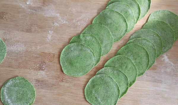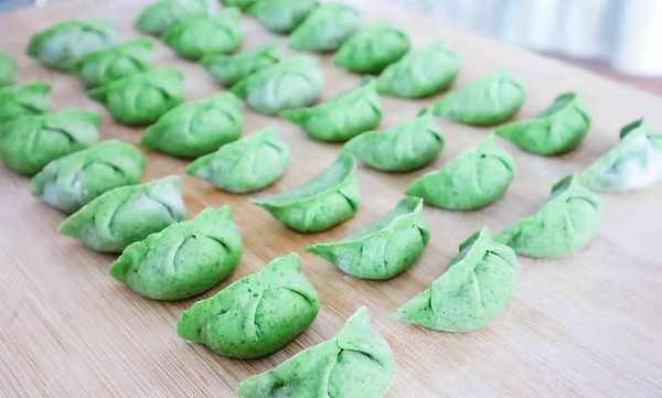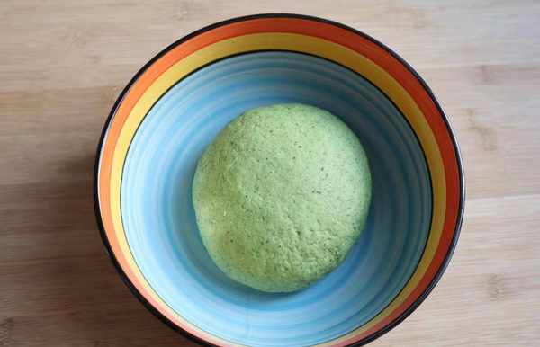 今天準備瞭1把菠菜,洗凈焯水後切成小段,放入料理機中,加入適量的清水打成菠菜汁;把打好的菠菜汁分次倒入事先準備好的面粉中,邊倒邊用筷子攪拌,攪拌至面粉全部呈絮狀時,下手和成一個軟硬適中、光滑的面團,蒙上保鮮膜餳面半個小時。