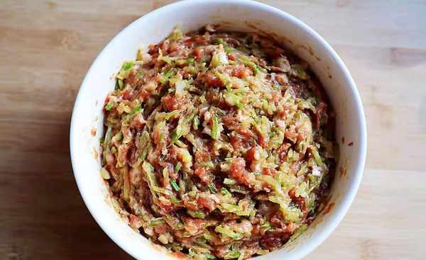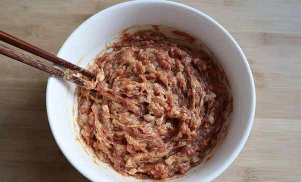 將醃制過的蘿卜絲用手擠掉多餘的水分,放在菜板上簡單地剁幾刀,不需要剁得太碎,絲不要太長就可以瞭;然後放入肉餡中攪拌至與肉餡混合均勻,這樣我們的餃子餡料就調好瞭。
