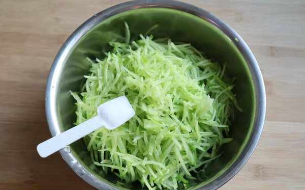 2、調餡:準備一個中等大小的青蘿卜,去皮洗凈後擦成細絲,加入1小勺食鹽,攪拌均勻後醃制10分鐘;加鹽的目的:一是去除蘿卜中多餘的水分,二是緩解蘿卜的辛辣味。
