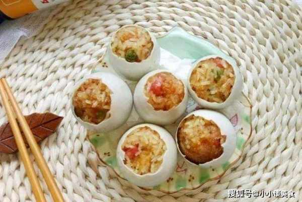 第五步:將鹵好的糯米、火腿、玉米粒等填滿蛋殼,至80%滿。