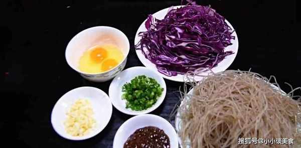 首先我們準備好食材,紫甘藍洗凈切段,蔥切段,醬油10克,蒜末,泡面一把,雞蛋兩個。按照圖片準備材料。