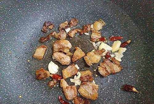 3、五花肉有點肥,直接在鍋裡炸肥肉,倒出多餘的肥肉,加入蒜蓉和幹辣椒文火爆香。