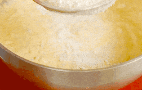 接著篩入加瞭泡打粉的低筋面粉,用刮刀從2點鐘方向切入盆底、再從8點鐘方向翻起,翻拌均勻至沒有明顯的幹粉。