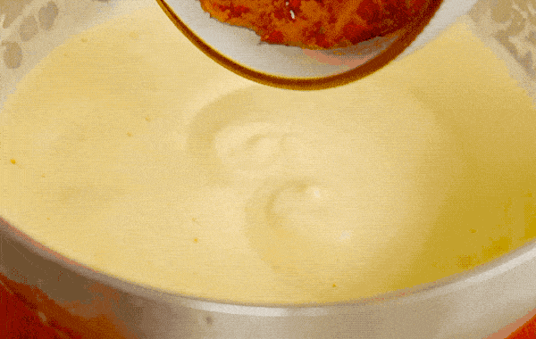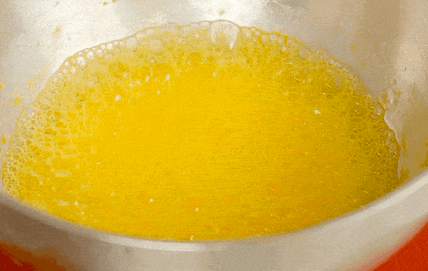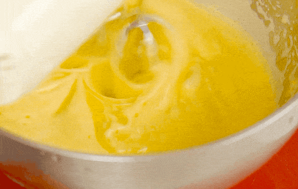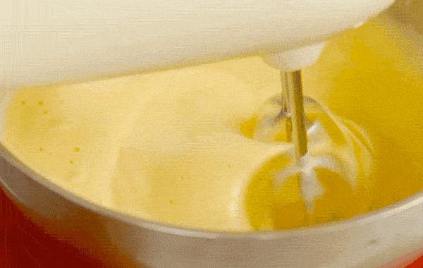 5分鐘後,蛋液體積明顯膨脹瞭、顏色變成淺淺的鵝黃色。這時候提起蛋液畫Z或8字型,蛋液的紋路可以保持8秒不消失的狀態,打發就到位瞭。