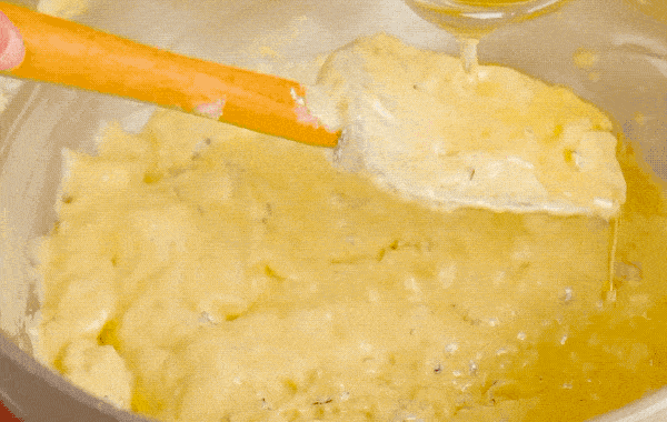 繼續用翻拌的手法將油和面糊拌勻,大約30下。