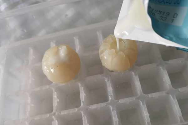 第四步,把所有的荔枝都剝好、去核之後,把荔枝肉放入容器中間隔擺放好,然後依次倒入適量酸奶。(酸奶要適量,不要溢出來瞭哦,可以放些水果粒如芒果、火龍果等在上面做裝飾。)