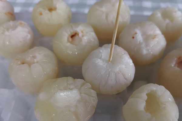 第二步,取一顆荔枝,從頂部開始,去掉蒂,開一個小口。
