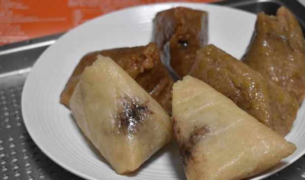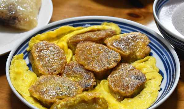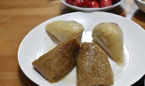 我丈夫很喜歡吃煎粽子,他留瞭幾塊煎粽子給我。他品嘗瞭咸味的五香咸肉粽和甜味紅豆沙。