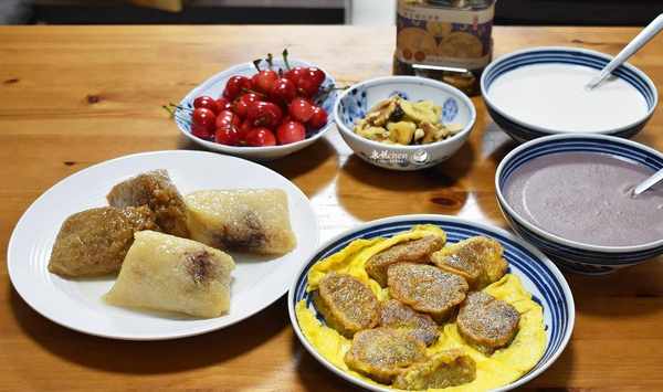 這是我們兩口子今天的早餐,分別有蒸五香咸肉粽和紅豆沙粽、香煎肉粽、紅豆燕麥糊、每日堅果和櫻桃。