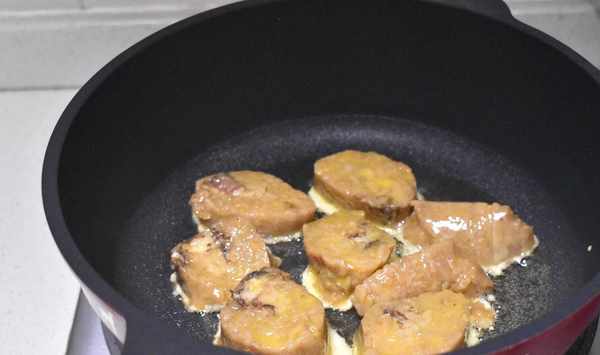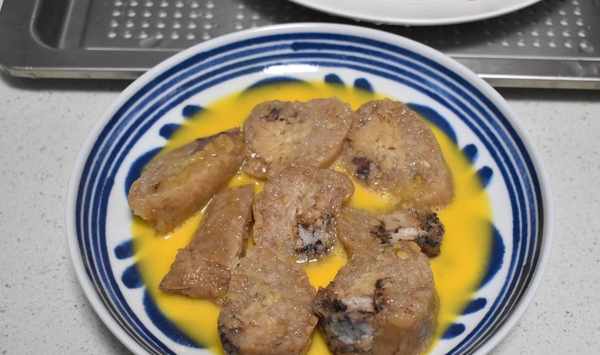 我把兩隻鮮肉粽切成小段,不要切太厚,因為太厚要花比較長時間煎好粽子,粽子也不能切得太薄。一隻雞蛋打發幾下,把鮮肉粽放入蛋液中,粽子兩面都沾滿蛋液。