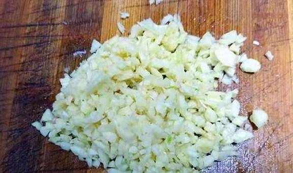 2、大蒜去皮,洗凈後剁成蒜蓉。我大概用瞭兩頭蒜,如果想風味更好可以再加點。生薑去皮,洗凈剁碎,不喜歡可以不加。