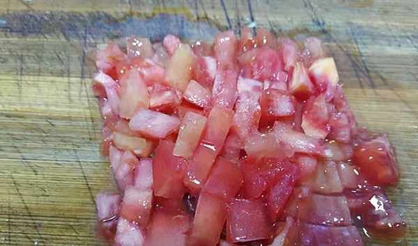 3、挑選一個比較紅亮的西紅柿,口感比較面,汁水多也容易染色,洗凈後剁碎。小把香菜洗凈後瀝幹水分,後面過油要用。