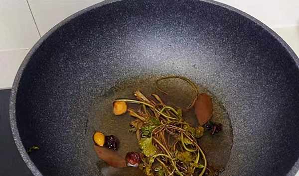 4、起鍋,燒幹鍋內水分,加小淺鍋油。開中火燒熱後再改為小火,丟入香菜和八角,慢慢攪拌至香菜發黃後再丟入其他香料繼續熬,等香菜變幹後將所有食材撈出瀝油丟掉。