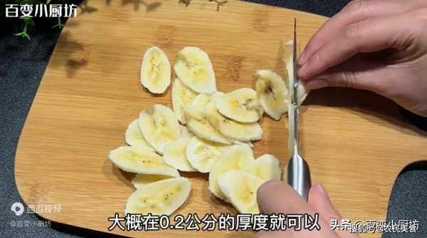 切香蕉的時候不要切得太厚瞭,大概在0.2公分的厚度就可以。切好之後先收入碗中,裝好後先放在一旁備用。