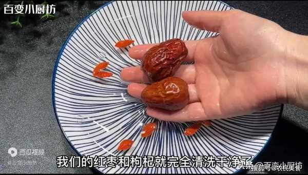接下來準備十幾顆枸杞,兩顆大棗,少量的清水加一勺食用純堿。