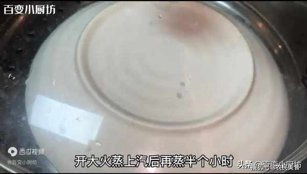 接著再蓋上鍋蓋,開大火蒸上汽後再蒸半個小時。半個小時過去瞭,揭開鍋蓋,先把表面的盆子取出來。
