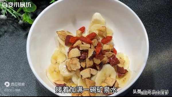 全部處理好後,和香蕉倒在一起。接著加滿一碗礦泉水,傢裡面沒有礦泉水的話,也可以用純凈水來代替。