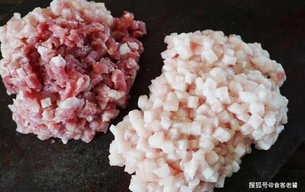 另取三肥七瘦的五花塊一塊,為瞭方便切成顆粒感,可以事先放在冰箱冷凍一會兒。然後將肥肉和瘦肉分別切丁,瘦肉部分則需要用少許黃酒醃制提香。