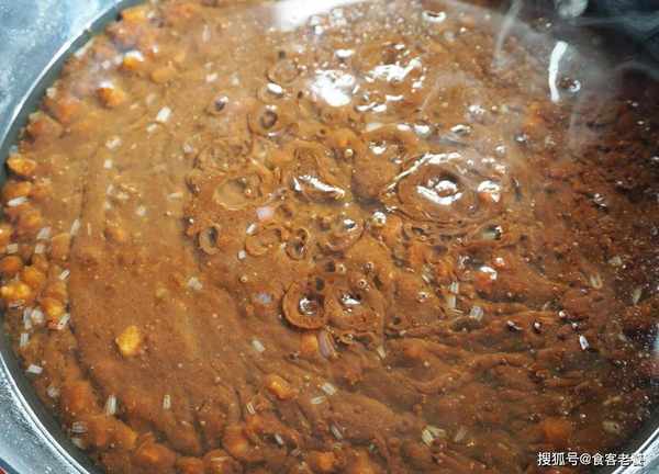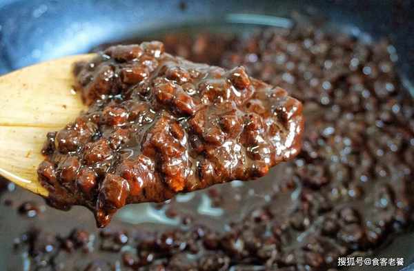 攪拌一會兒之後,待油和醬融合,此刻醬汁已經將油脂吸收瞭,醬汁也變得發亮。繼續攪拌熬制,讓水汽一點點蒸發掉。直到醬慢慢熬的顏色變深、變濃稠,肥肉丁也被醬咕嚕的透明狀、入口即化,這樣的醬吃起來才不會發膩。