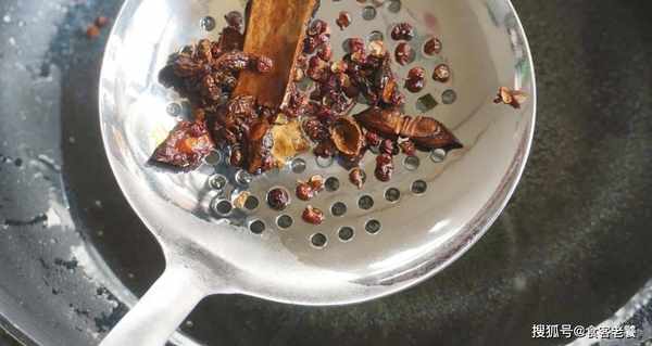 起鍋放涼油,下入八角、桂皮和花椒用小火炸。待油熱瞭,香料的香味就出來瞭,此時就需要將香料撈出,避免炸糊。