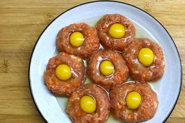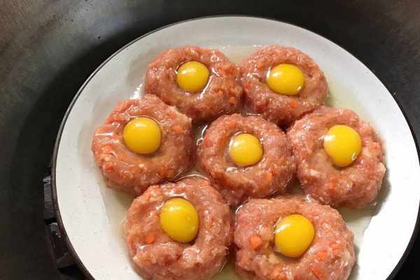 5、將鵪鶉蛋倒入在肉餡中的留出來的位置。