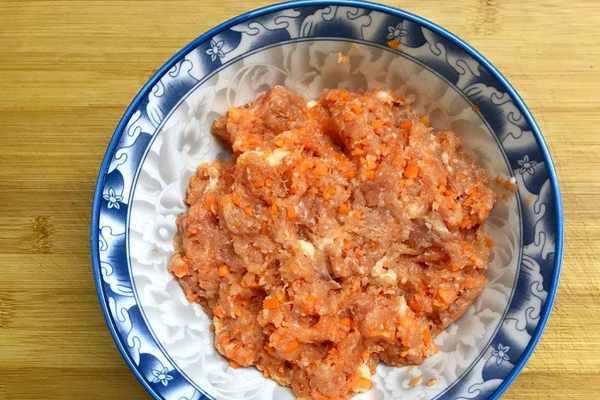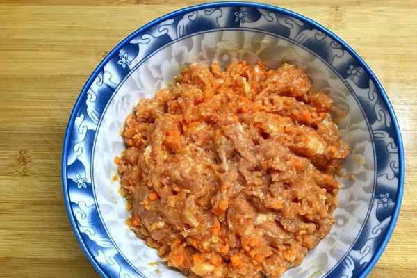3、肉餡中加入瞭一個胡蘿卜這樣不會覺有膩,大傢也可以根據自己的喜好來適當添加自己喜歡的食材。