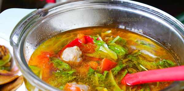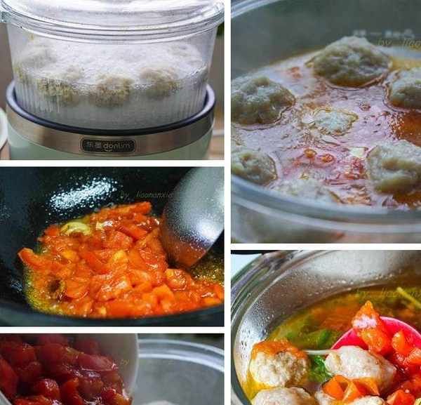丸子是前段時間做好凍在冰箱中的,吃的時候不用化凍,直接下鍋煮透就可以。咱們把西紅柿切成小塊,用油煸炒後倒入丸子湯中煮幾分鐘,最後加上青椒,用鹽和白胡椒粉調味,酸酸得非常好喝。