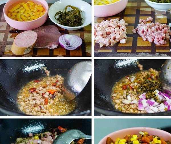 材料:牛瘦肉,火腿,甜玉米粒,酸菜,幹辣椒,花椒,洋蔥,油,鹽,生抽,料酒。