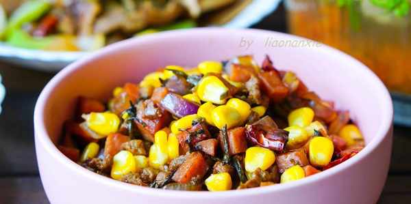 吃飯的時候老媽解釋說這個牛肉火腿炒玉米粒是湊出來的,本來是準備用牛肉炒玉米粒,結果發現隻有一小塊牛肉,索性加上火腿一起炒。老媽總是能把各種食物搭配在一起,卻一點兒也不別扭。結果這道菜女兒特別喜歡,拌著米飯吃可香瞭。