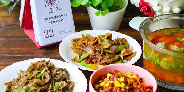 午飯組合:牛肉火腿炒玉米,青椒羊肚,素炒人造肉,西紅柿丸子湯,米飯。